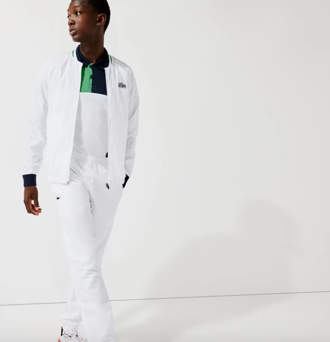 A lightweight water-resistant nylon, lined with breathable mesh, makes this Lacoste Sport teddy jacket irresistible. It is adorned with lines recalling the tennis court and it is equipped with an elasticised bottom, a neck in striped ribbing and contrasting cuffs. Made for training in any kind of weather.